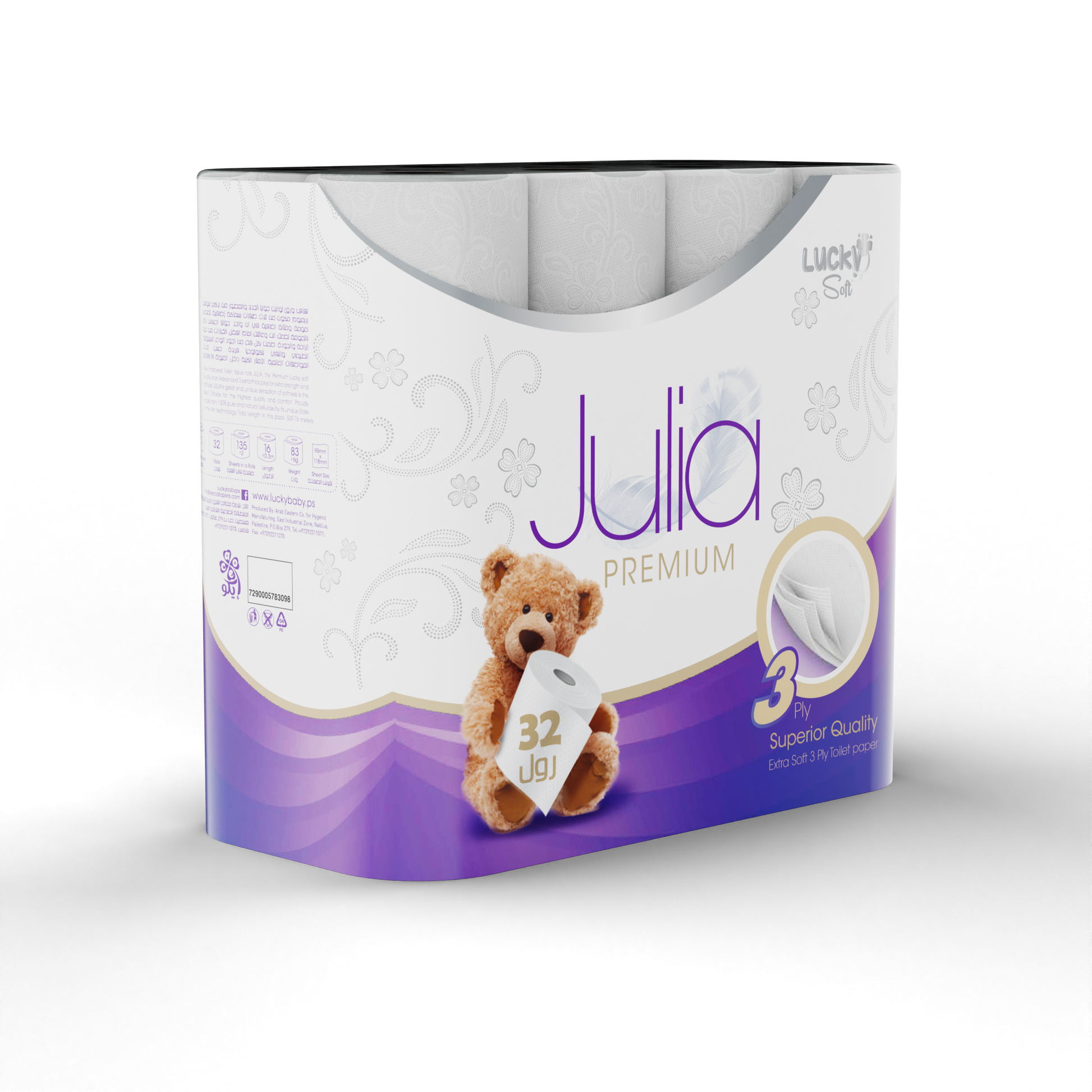 Julia Premium presents: Luxurious Softness in Every Sheet with 32-Roll Soft Touch Toilet Paper. Elevate your daily routine with the lavish comfort of our ultra-soft, premium quality toilet paper.